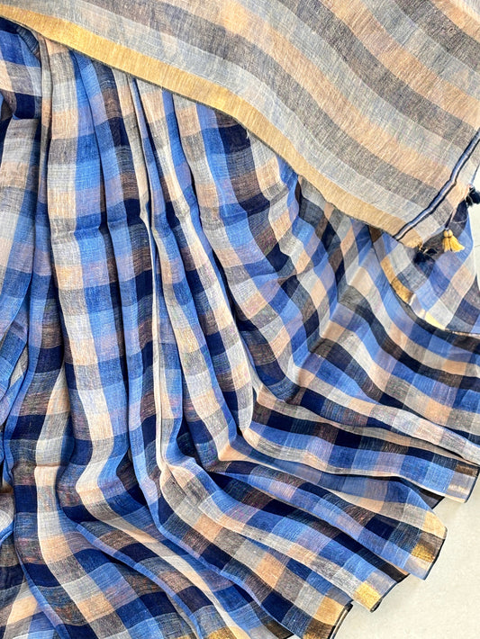 Handwoven pure linen check saree